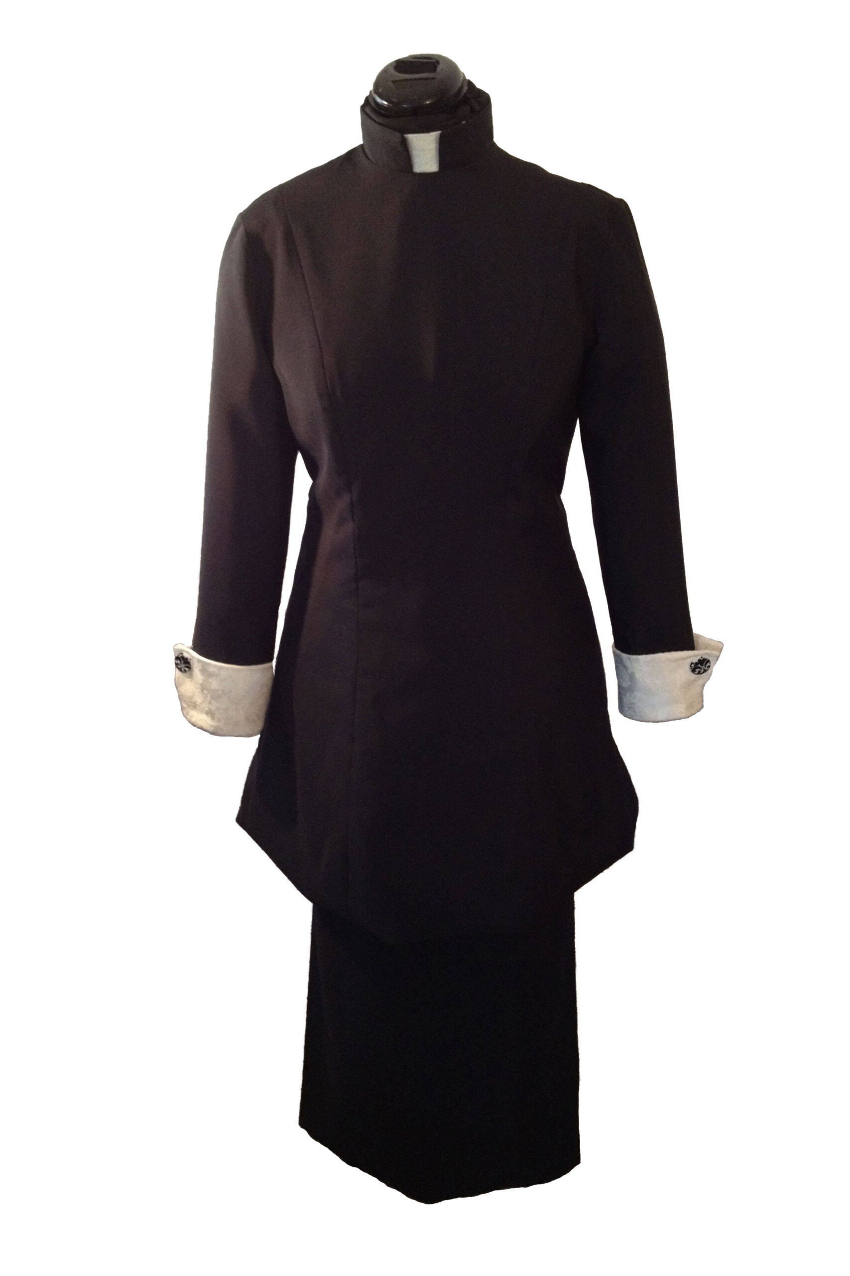 Designer Women’s Clergy Suit. Suit has an elastic waist skirt and a three quarter length top with a back zipper.